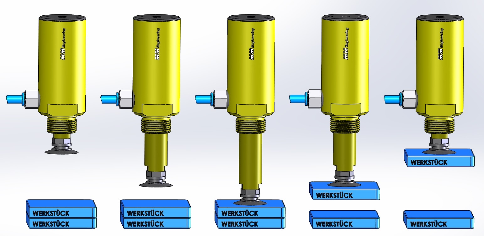 Sobald das Werkstück gegriffen wird kehrt der Kolben mit angesaugtem Werkstück bltzschnell um.