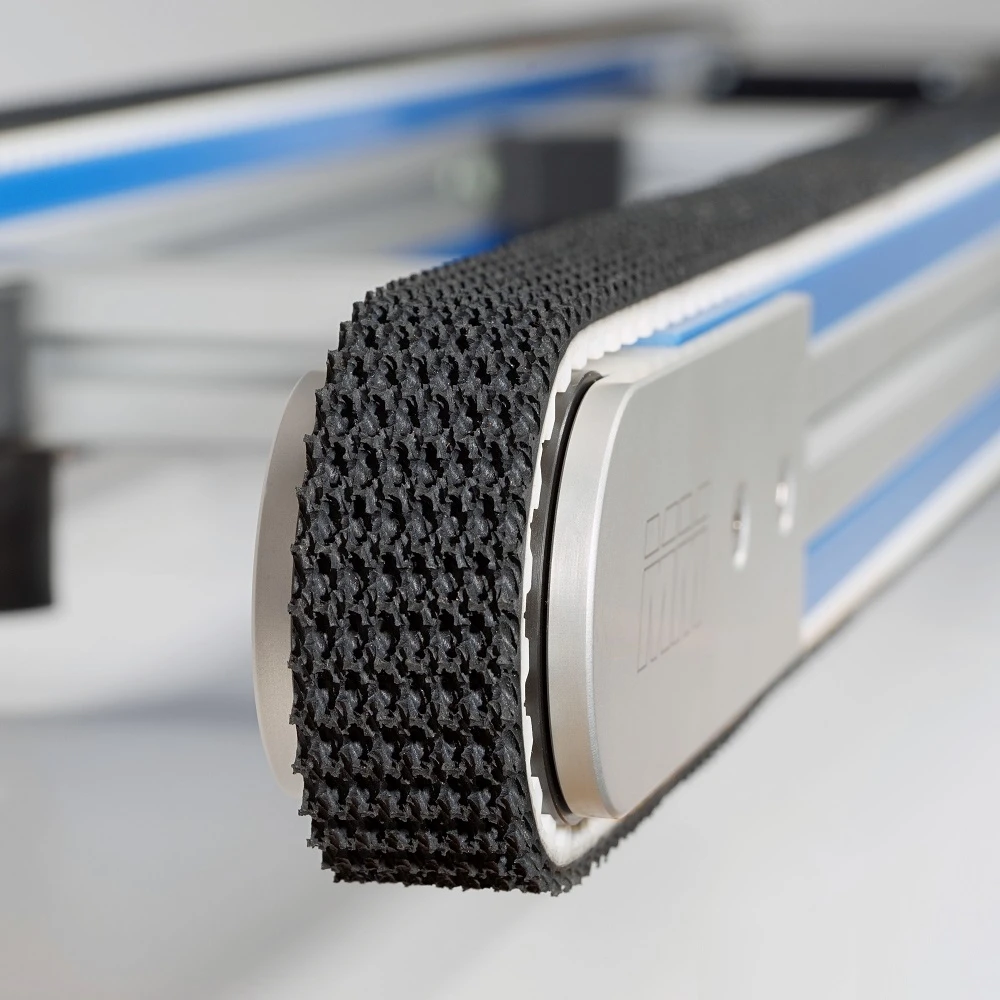 The toothed conveyor belt is completely free here, without interfering side guides, flanged pulleys or other guide elements.